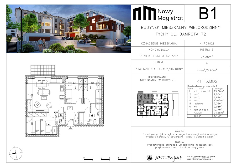 Mieszkanie składa się z salonu z kuchnią, 3 pokoi, 2 łazienek, komunikacji i balkonu o pow. 5,40 mkw.