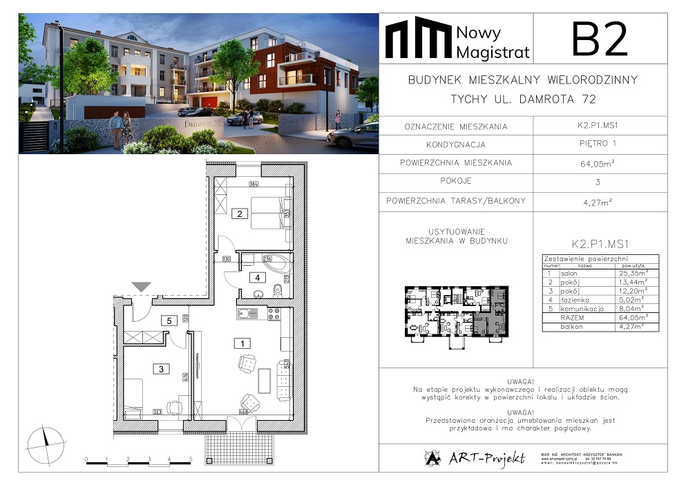 Mieszkanie składa się z salonu z kuchnią, 2 pokoi, łazienki, komunikacji i balkonu o powierzchni 4,20 mkw.