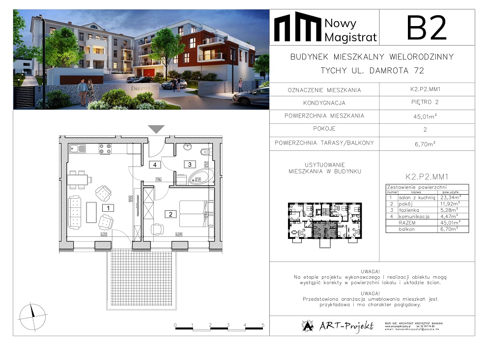 Mieszkanie składa się z salonu z kuchnią, pokoju, łazienki, komunikacji i balkonu o powierzchni 6,70 mkw.